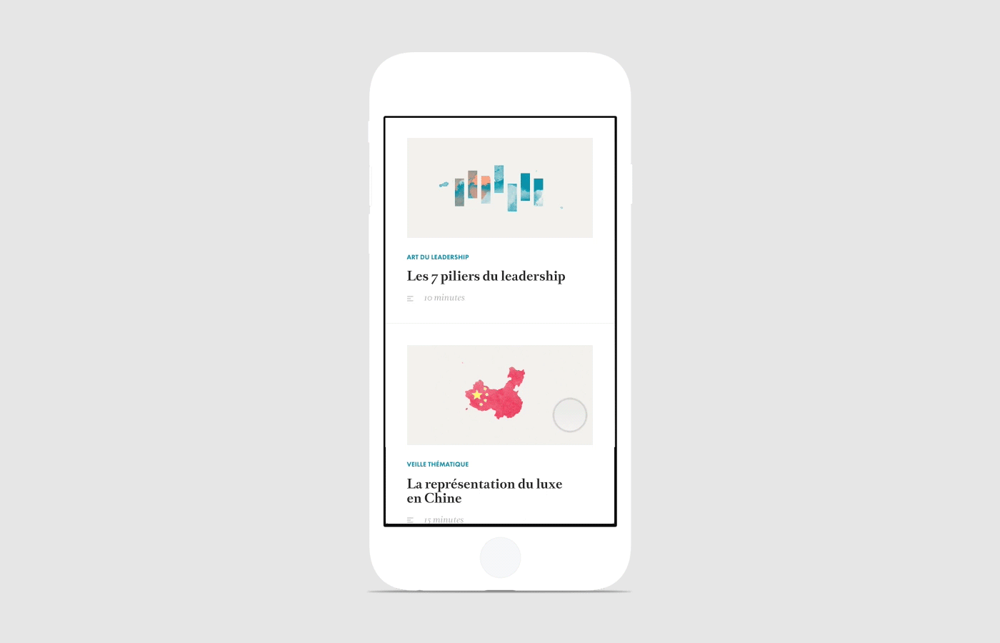 We developed a dedicated illustration style for the app to ensure a cohesive art direction among the app. Each article could be illustrated by a series of pictures, a video or a dedicated artwork mixing minimal and abstract inspirations.
